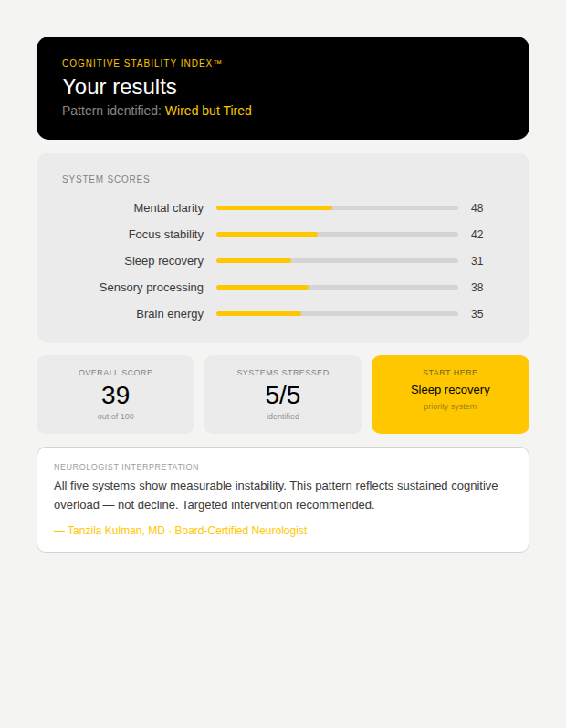 Your Cognitive Stability Index™ results indicate measurable demand across multiple neurological systems responsible for cognitive performance, energy regulation, and recovery.